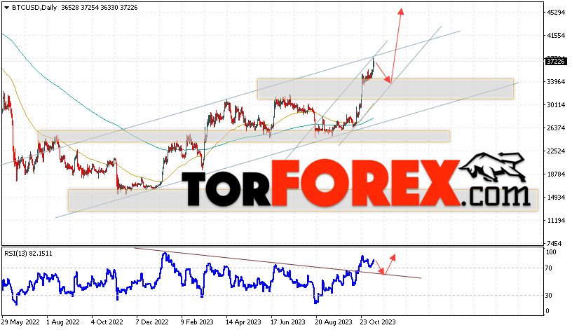 Дополнительным сигналом в пользу подъёма котировок BTC/USD на текущей торговой неделе 13 — 17 ноября 2023 выступит отскок от нижней границы бычьего канала. Вторым сигналом станет отскок от линии поддержки на индикаторе относительной силы (RSI), которая была пробита вверх покупателями. Отменой варианта роста Bitcoin станет падение и пробой области 29865. Это укажет на пробой области поддержки и продолжение падения котировок BTC/USD с потенциальной целью ниже уровня 24605. Подтверждением развития бычьего движения выступит пробой области сопротивления и закрытие котировок выше уровня 41505, что укажет на пробой верхней границы бычьего канала, а это сигнал к росту на ширину канала.