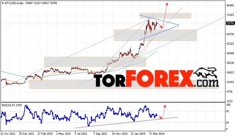 Дополнительным сигналом в пользу подъёма котировок BTC/USD на текущей торговой неделе 15 — 19 апреля 2024 выступит отскок от нижней границы модели «Треугольник». Вторым сигналом станет отскок от линии поддержки на индикаторе относительной силы (RSI). Отменой варианта роста Bitcoin станет падение и пробой области 58505. Это укажет на пробой области поддержки и продолжение падения котировок BTC/USD с потенциальной целью ниже уровня 51605. Подтверждением развития бычьего движения выступит пробой области сопротивления и закрытие котировок выше уровня 72045, что укажет на пробой верхней границы модели «Треугольник» и начало отработки паттерна с целями вверху.