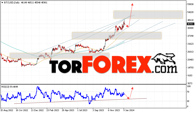 Дополнительным сигналом в пользу подъёма котировок BTC/USD на текущей торговой неделе 15 — 19 января 2024 выступит отскок от нижней границы бычьего канала. Вторым сигналом станет отскок от линии поддержки на индикаторе относительной силы (RSI). Отменой варианта роста Bitcoin станет падение и пробой области 41655. Это укажет на пробой области поддержки и продолжение падения котировок BTC/USD с потенциальной целью ниже уровня 35605. Подтверждением развития бычьего движения выступит пробой области сопротивления и закрытие котировок выше уровня 51075, что укажет на пробой верхней границы бычьего канала, а это сигнал к росту на ширину канала.
