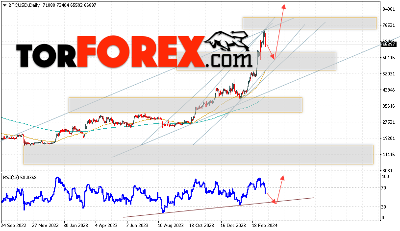 Дополнительным сигналом в пользу подъёма котировок BTC/USD на текущей торговой неделе 18 — 22 марта 2024 выступит отскок от нижней границы бычьего канала. Вторым сигналом станет отскок от линии поддержки на индикаторе относительной силы (RSI). Отменой варианта роста Bitcoin станет падение и пробой области 43405. Это укажет на пробой области поддержки и продолжение падения котировок BTC/USD с потенциальной целью ниже уровня 35605. Подтверждением развития бычьего движения выступит пробой области сопротивления и закрытие котировок выше уровня 77805.