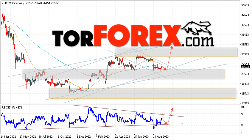 Дополнительным сигналом в пользу подъёма котировок BTC/USD на текущей торговой неделе 18 — 22 сентября 2023 выступит отскок от нижней границы бычьего канала. Вторым сигналом станет отскок от линии поддержки на индикаторе относительной силы (RSI). Отменой варианта роста Bitcoin станет падение и пробой области 22505. Это укажет на пробой области поддержки и продолжение падения котировок BTC/USD с потенциальной целью ниже уровня 18675. Подтверждением развития бычьего движения выступит пробой области сопротивления и закрытие котировок выше уровня 28265, что укажет на пробой верхней границы нисходящего канала коррекции.