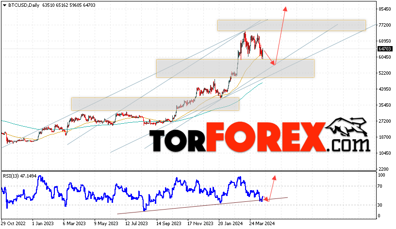 Дополнительным сигналом в пользу подъёма котировок BTC/USD на текущей торговой неделе 22 — 26 апреля 2024 выступит отскок от нижней границы бычьего канала. Вторым сигналом станет отскок от линии поддержки на индикаторе относительной силы (RSI). Отменой варианта роста Bitcoin станет падение и пробой области 51605. Это укажет на пробой области поддержки и продолжение падения котировок BTC/USD с потенциальной целью ниже уровня 44605. Подтверждением развития бычьего движения выступит пробой области сопротивления и закрытие котировок выше уровня 72045.