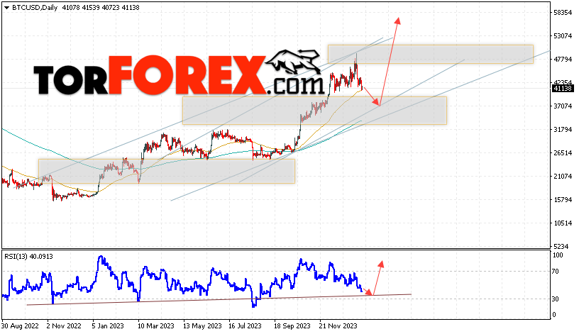Дополнительным сигналом в пользу подъёма котировок BTC/USD на текущей торговой неделе 22 — 26 января 2024 выступит отскок от нижней границы бычьего канала. Вторым сигналом станет отскок от линии поддержки на индикаторе относительной силы (RSI). Отменой варианта роста Bitcoin станет падение и пробой области 32065. Это укажет на пробой области поддержки и продолжение падения котировок BTC/USD с потенциальной целью ниже уровня 27605. Подтверждением развития бычьего движения выступит пробой области сопротивления и закрытие котировок выше уровня 48065.