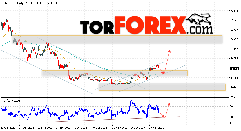 Дополнительным сигналом в пользу подъёма котировок BTC/USD на текущей торговой неделе 24 — 28 апреля 2023 выступит отскок от нижней границы бычьего канала. Вторым сигналом станет отскок от линии поддержки на индикаторе относительной силы (RSI). Отменой варианта роста Bitcoin станет падение и пробой области 18935. Это укажет на пробой области поддержки и продолжение падения котировок BTC/USD с потенциальной целью ниже уровня 16545. Подтверждением развития бычьего движения выступит пробой области сопротивления и закрытие котировок выше уровня 36085, что укажет на пробой верхней границы бычьего канала, а это сигнал к росту на ширину канала.