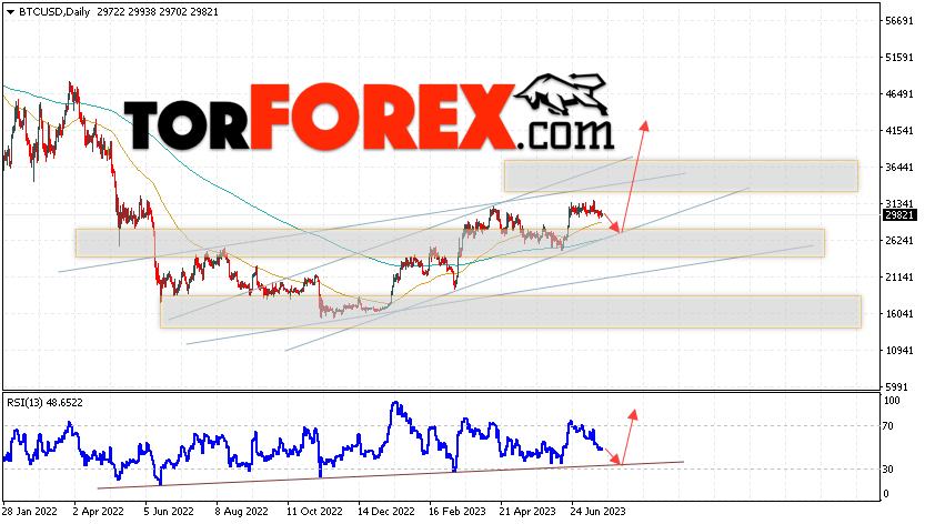 Дополнительным сигналом в пользу подъёма котировок BTC/USD на текущей торговой неделе 24 — 28 июля 2023 выступит отскок от нижней границы бычьего канала. Вторым сигналом станет отскок от линии поддержки на индикаторе относительной силы (RSI). Отменой варианта роста Bitcoin станет падение и пробой области 21065. Это укажет на пробой области поддержки и продолжение падения котировок BTC/USD с потенциальной целью ниже уровня 17455. Подтверждением развития бычьего движения выступит пробой области сопротивления и закрытие котировок выше уровня 33605, что укажет на пробой верхней границы бычьего канала, а это сигнал к росту на ширину канала.