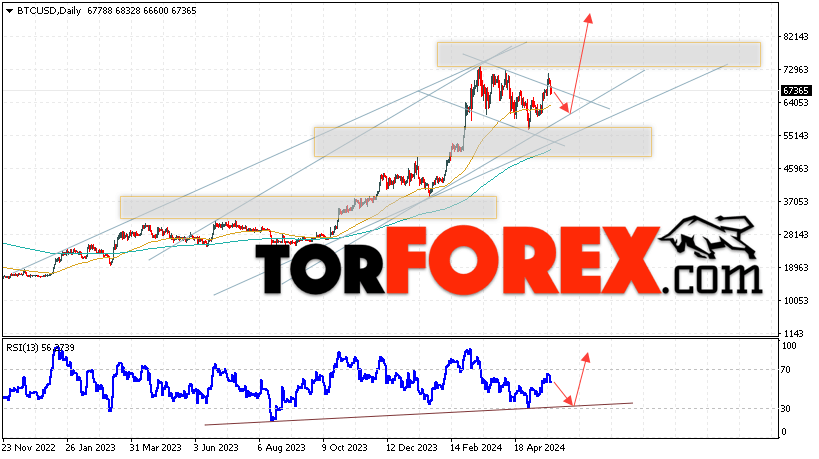 Дополнительным сигналом в пользу подъёма котировок BTC/USD на текущей торговой неделе 27 — 31 мая 2024 выступит отскок от нижней границы бычьего канала. Вторым сигналом станет отскок от линии поддержки на индикаторе относительной силы (RSI). Отменой варианта роста Bitcoin станет падение и пробой области 54045. Это укажет на пробой области поддержки и продолжение падения котировок BTC/USD с потенциальной целью ниже уровня 45605. Подтверждением развития бычьего движения выступит пробой области сопротивления и закрытие котировок выше уровня 73045, что укажет на пробой верхней границы медвежьего канала коррекции.