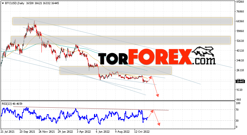 Дополнительным сигналом в пользу падения котировок BTC/USD на текущей торговой неделе 28 ноября — 2 декабря 2022 выступит отскок от верхней границы нисходящего канала. Вторым сигналом станет отскок от линии сопротивления на индикаторе относительной силы (RSI). Отменой варианта падения Bitcoin станет сильный рост и пробой области 25405. Это укажет на пробой области сопротивления и продолжение роста котировок BTC/USD с потенциальной целью выше уровня 30505. Подтверждением развития нисходящего движения выступит пробой области поддержки и закрытие котировок ниже уровня 15005.