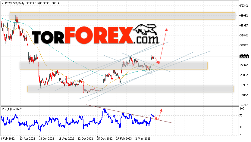 Дополнительным сигналом в пользу подъёма котировок BTC/USD на текущей торговой неделе 3 — 7 июля 2023 выступит отскок от верхней границы медвежьего канала. Вторым сигналом станет отскок от линии поддержки на индикаторе относительной силы (RSI). Отменой варианта роста Bitcoin станет падение и пробой области 23405. Это укажет на пробой области поддержки и продолжение падения котировок BTC/USD с потенциальной целью ниже уровня 18505. Подтверждением развития бычьего движения выступит пробой области сопротивления и закрытие котировок выше уровня 32505.
