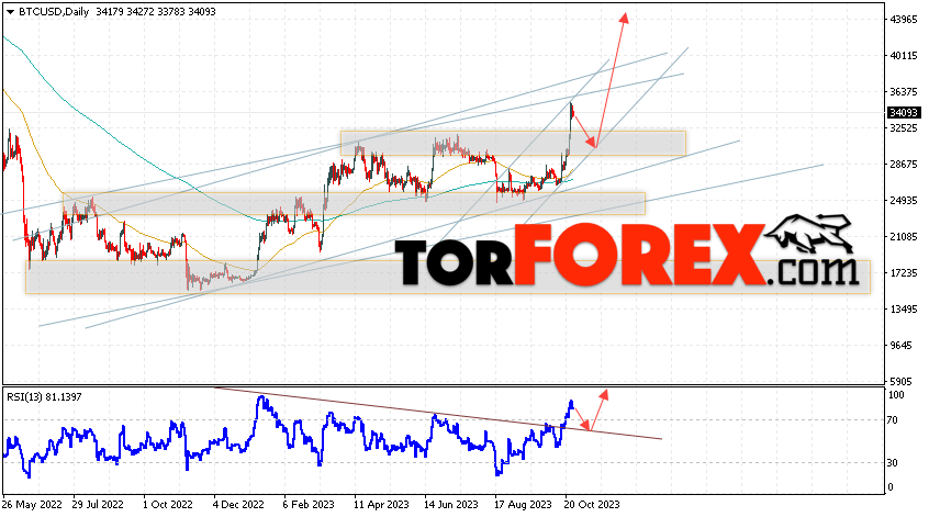 Дополнительным сигналом в пользу подъёма котировок BTC/USD на текущей торговой неделе 30 октября — 3 ноября 2023 выступит отскок от нижней границы бычьего канала. Вторым сигналом станет отскок от линии поддержки на индикаторе относительной силы (RSI), которая была пробита вверх покупателями. Отменой варианта роста Bitcoin станет падение и пробой области 23055. Это укажет на пробой области поддержки и продолжение падения котировок BTC/USD с потенциальной целью ниже уровня 18465. Подтверждением развития бычьего движения выступит пробой области сопротивления и закрытие котировок выше уровня 37065, что укажет на пробой верхней границы бычьего канала, а это сигнал к росту на ширину канала.