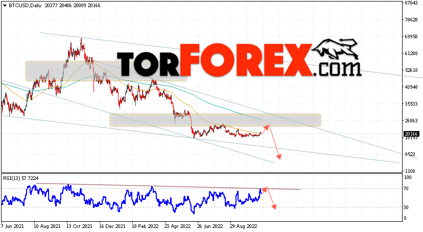 Дополнительным сигналом в пользу падения котировок BTC/USD на текущей торговой неделе 31 октября — 4 ноября 2022 выступит отскок от верхней границы нисходящего канала. Вторым сигналом станет отскок от линии сопротивления на индикаторе относительной силы (RSI). Отменой варианта падения Bitcoin станет сильный рост и пробой области 28705. Это укажет на пробой области сопротивления и продолжение роста котировок BTC/USD с потенциальной целью выше уровня 33565. Подтверждением развития нисходящего движения выступит пробой области поддержки и закрытие котировок ниже уровня 9055, что укажет на пробой нижней границы нисходящего канала, а сигнал к продажам на ширину канала.