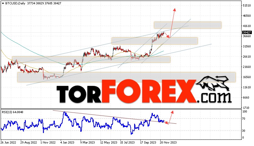 Дополнительным сигналом в пользу подъёма котировок BTC/USD на текущей торговой неделе 4 — 8 декабря 2023 выступит отскок от нижней границы бычьего канала. Вторым сигналом станет отскок от линии поддержки на индикаторе относительной силы (RSI). Отменой варианта роста Bitcoin станет падение и пробой области 31505. Это укажет на пробой области поддержки и продолжение падения котировок BTC/USD с потенциальной целью ниже уровня 26705. Подтверждением развития бычьего движения выступит пробой области сопротивления и закрытие котировок выше уровня 41805, что укажет на пробой верхней границы бычьего канала, а это сигнал к росту на ширину канала.