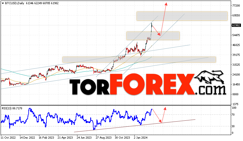 Дополнительным сигналом в пользу подъёма котировок BTC/USD на текущей торговой неделе 4 — 8 марта 2024 выступит отскок от нижней границы бычьего канала. Вторым сигналом станет отскок от линии поддержки на индикаторе относительной силы (RSI). Отменой варианта роста Bitcoin станет падение и пробой области 45905. Это укажет на пробой области поддержки и продолжение падения котировок BTC/USD с потенциальной целью ниже уровня 41605. Подтверждением развития бычьего движения выступит пробой области сопротивления и закрытие котировок выше уровня 63505.