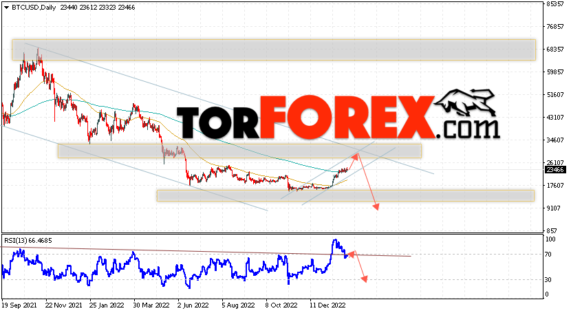 Дополнительным сигналом в пользу снижения котировок BTC/USD на текущей торговой неделе 6 — 10 февраля 2023 выступит отскок от верхней границы нисходящего канала. Вторым сигналом станет отскок от линии сопротивления на индикаторе относительной силы (RSI), как видим значения индикатора вернулись под линию, что может указывать на ложный пробой вверх, который был совсем недавно. Отменой варианта падения Bitcoin станет сильный рост и пробой области 33055. Это укажет на пробой области сопротивления и продолжение роста котировок BTC/USD с потенциальной целью выше уровня 37505. Подтверждением развития нисходящего движения выступит пробой области поддержки и закрытие котировок ниже уровня 21605, что укажет на пробой нижней границы бычьего канала коррекции.