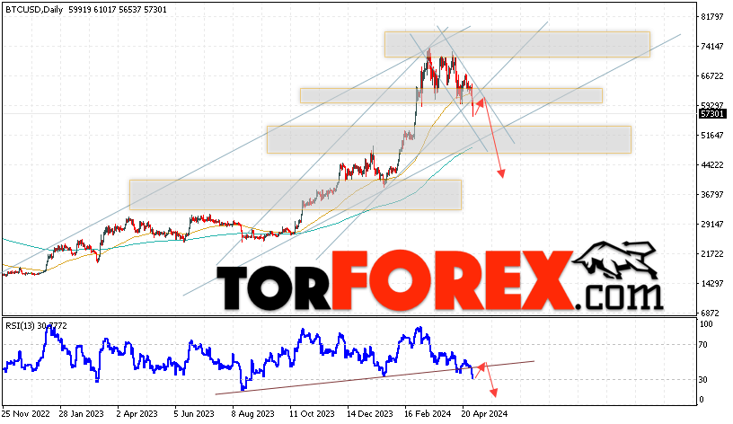 Дополнительным сигналом в пользу падения котировок BTC/USD на текущей торговой неделе 6 — 10 мая 2024 выступит отскок от верхней границы медвежьего канала. Вторым сигналом станет отскок от линии сопротивления на индикаторе относительной силы (RSI). Отменой варианта падения Bitcoin станет сильный рост и пробой области 66705. Это укажет на пробой области сопротивления и продолжение роста котировок BTC/USD с потенциальной целью выше уровня 72505. Подтверждением развития медвежьего движения выступит пробой области поддержки и закрытие котировок ниже уровня 50805, что укажет на пробой нижней границы бычьего канала.