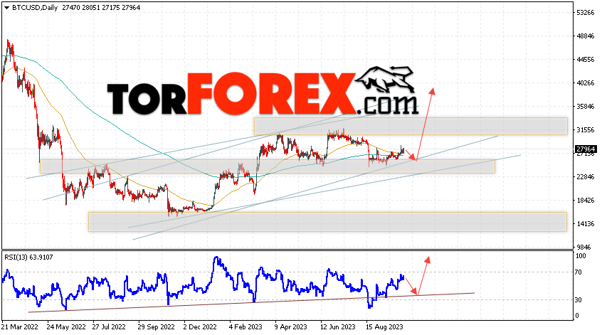 Дополнительным сигналом в пользу подъёма котировок BTC/USD на текущей торговой неделе 9 — 13 октября 2023 выступит отскок от нижней границы бычьего канала. Вторым сигналом станет отскок от линии поддержки на индикаторе относительной силы (RSI). Отменой варианта роста Bitcoin станет падение и пробой области 22605. Это укажет на пробой области поддержки и продолжение падения котировок BTC/USD с потенциальной целью ниже уровня 18805. Подтверждением развития бычьего движения выступит пробой области сопротивления и закрытие котировок выше уровня 28985.