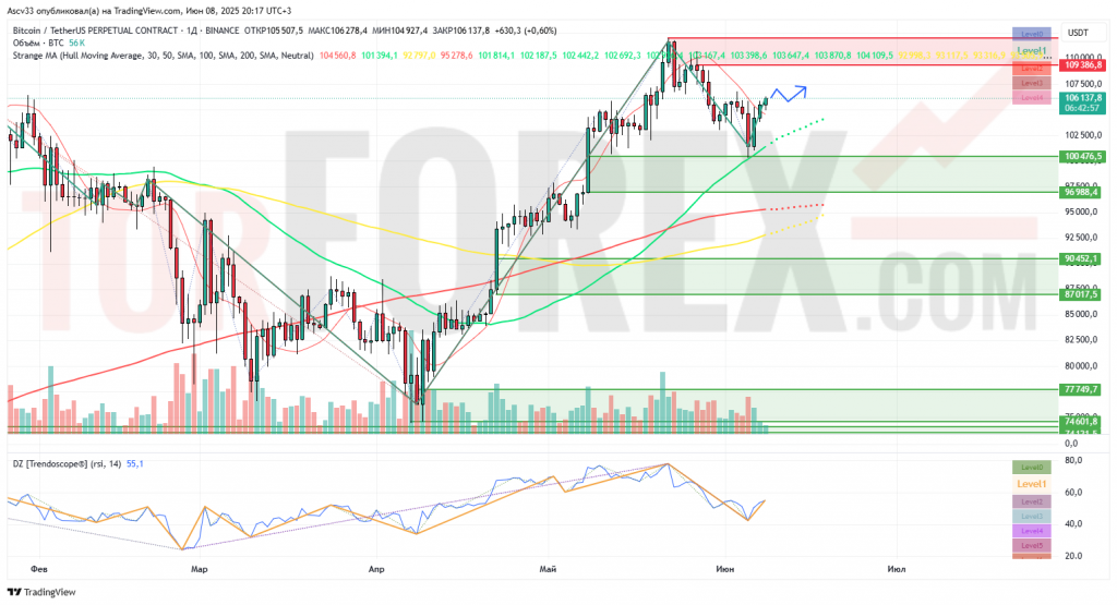 Если BTC преодолеет $107,500 и закрепится выше $109,000, откроется путь к $112,000 и выше. Для этого необходим всплеск объёмов и общий рост интереса со стороны покупателей.
