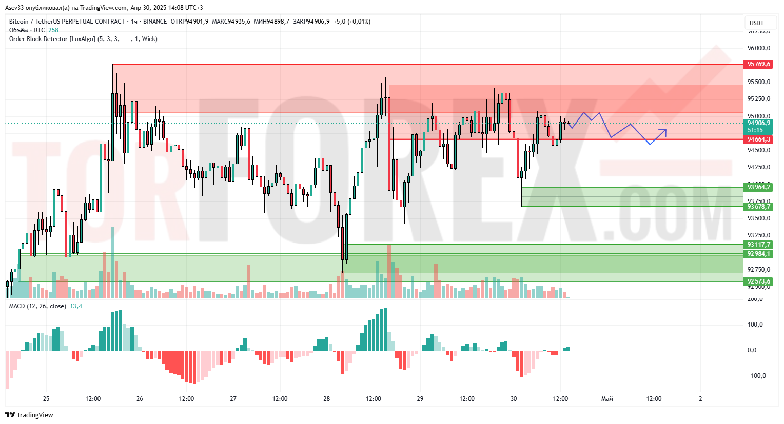 Торговля в пределах диапазона 94 500 – 95 000 с повышенной вероятностью краткосрочного снижения к 93 600–93 900.