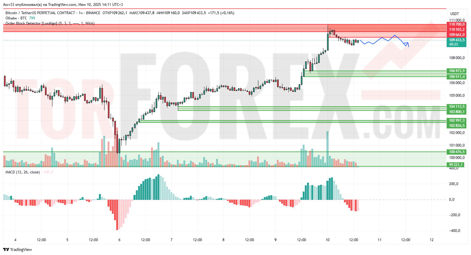 Биткоин демонстрирует ослабление восходящего импульса после роста к области сопротивления 110 100–111 000. Цена не смогла закрепиться выше этой зоны предложения, сформированной по данным индикатора Order Block Detector. На часовом графике наблюдается консолидация под сопротивлением, что может указывать на подготовку к коррекции. Объёмы снижаются, что подтверждает замедление спроса. Гистограмма MACD перешла в отрицательную зону, сигнализируя о вероятном краткосрочном снижении.