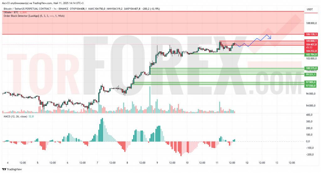 Ожидается продолжение консолидации в диапазоне 104 250–105 000 с вероятной попыткой пробоя вверх. При выходе выше 105 000 открывается путь к 106 100. В случае отката цена может протестировать поддержку у 102 800 или ниже.