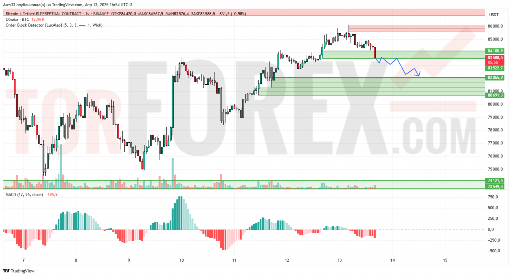 Анализ: Bitcoin сформировал максимум в районе $85,800 и начал коррекцию вниз. Цена пробила локальную поддержку $84,100 и движется в сторону зоны спроса $82,000–$80,700. Гистограмма MACD ушла в отрицательную зону, подтверждая смену импульса на нисходящий.
