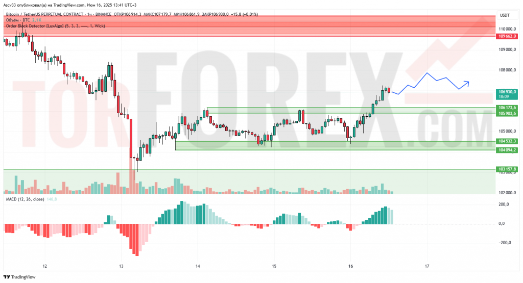 Приоритет остаётся за быками при условии удержания выше 105,900. Возможна краткосрочная консолидация перед атакой на сопротивление 109,600. Прорыв этой зоны откроет дорогу в район 111,000. Альтернативный сценарий — откат к 106,100 и ретест поддержки с последующим ростом.
