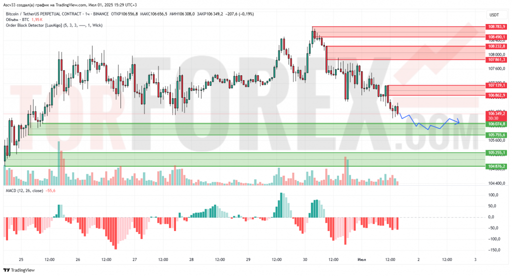 BTC/USD продолжает нисходящую коррекцию после неудачной попытки закрепления выше зоны сопротивления 107,860–108,784. Продавцы уверенно продавили цену ниже 107,140, что подтвердило наличие продавца в районе накопления. Пара пробила поддержку и достигла области 106,350, балансируя у верхней границы зоны спроса.