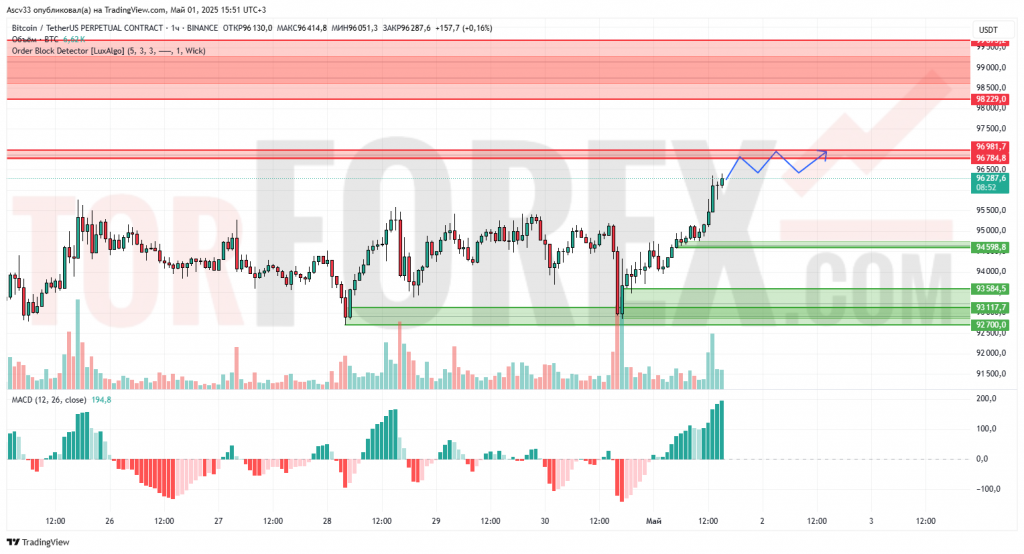Биткоин продолжает уверенное восстановление, пробив ключевую зону сопротивления вблизи 96 000 и закрепляясь выше. Сейчас цена находится у нижней границы зоны предложения 96 785–96 981, при этом объёмы резко выросли, что указывает на присутствие крупных игроков. Индикатор MACD демонстрирует сильный восходящий импульс, но приближение к насыщенной зоне сопротивления может привести к замедлению роста и консолидации.