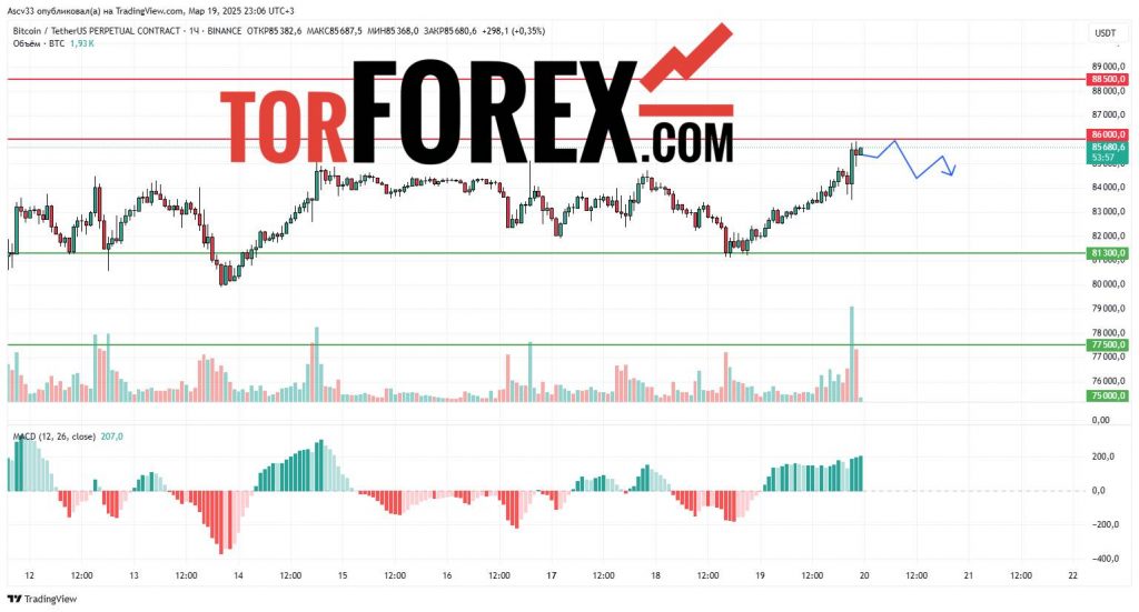 - 86,000 USD – пробой этого уровня может усилить бычий тренд и привести к дальнейшему росту до 88,000 USD.