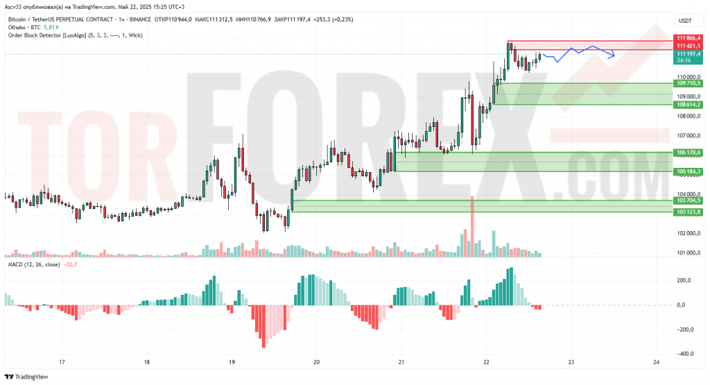 Биткоин торгуется вблизи зоны предложения 111 400–111 860 после сильного импульсного роста. Приближение к сопротивлению сопровождается ослаблением объёмов и замедлением гистограммы MACD, что указывает на затухание бычьей динамики. Рост сопровождался уверенным спросом, но текущая структура говорит о вероятности перехода к фазе консолидации.