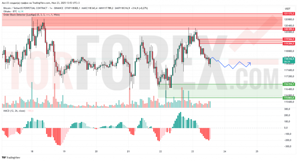 Ожидается боковое движение с понижательным уклоном в направлении 117500–116700. При сохранении давления возможен тест зоны 116000–115865 с попыткой отскока. Для возвращения к росту необходимо закрепление выше 119300.