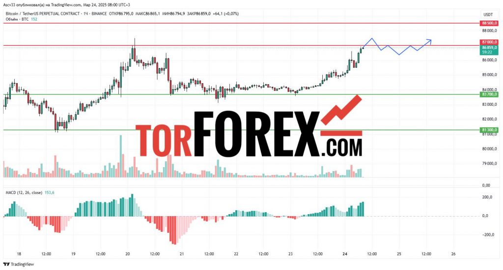Ожидается, что BTC/USD останется в диапазоне 83,700–87,000 USD в течение 24 марта. Пробой 87,000 USD вверх подтвердит восходящее движение, тогда как закрытие ниже 83,700 USD может усилить медвежьи настроения. Трейдерам рекомендуется внимательно следить за изменениями курса вблизи этих ключевых уровней, так как их прорыв может значительно повлиять на дальнейшую стратегию по криптовалюте.