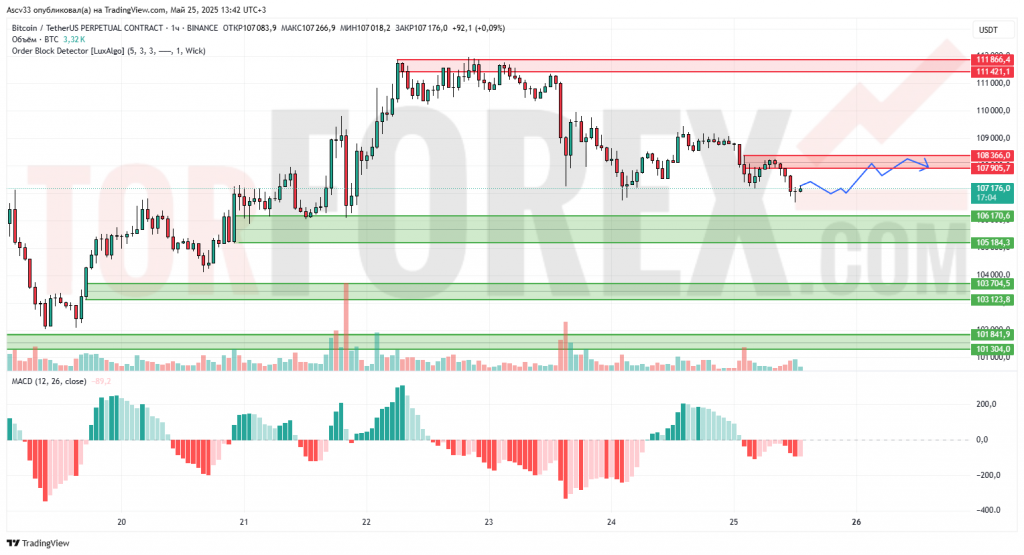 Ожидается продолжение боковой консолидации пары BTC/USD в диапазоне между текущей зоной сопротивления (107 905,7 — 108 366) и ближайшей зоной поддержки (105 184,3 — 106 170,6). Прорыв выше 108 366 может открыть путь к дальнейшему восстановлению, однако для этого потребуется значительное увеличение объёмов. В случае пробоя ниже 105 184,3, нисходящее давление усилится, и цена может достигнуть следующих уровней поддержки. На текущий момент приоритет сохраняется за нейтральным движением с потенциалом к дальнейшему снижению.