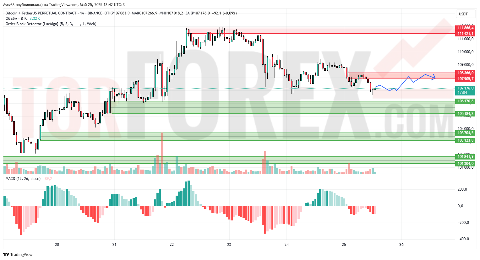 Пара BTC/USD демонстрирует нисходящий тренд после достижения максимумов в районе 111 886. В настоящее время цена находится в коррекционной фазе, пытаясь стабилизироваться. На графике видно формирование зоны сопротивления в районе 108 366 — 107 905,7. Объёмы торгов снизились, что указывает на уменьшение активности участников рынка. Индикатор MACD находится в отрицательной зоне и показывает слабую отрицательную гистограмму, что подтверждает текущую фазу консолидации с медвежьим уклоном. Цена находится выше зоны поддержки в районе 105 184,3 — 106 170,6.