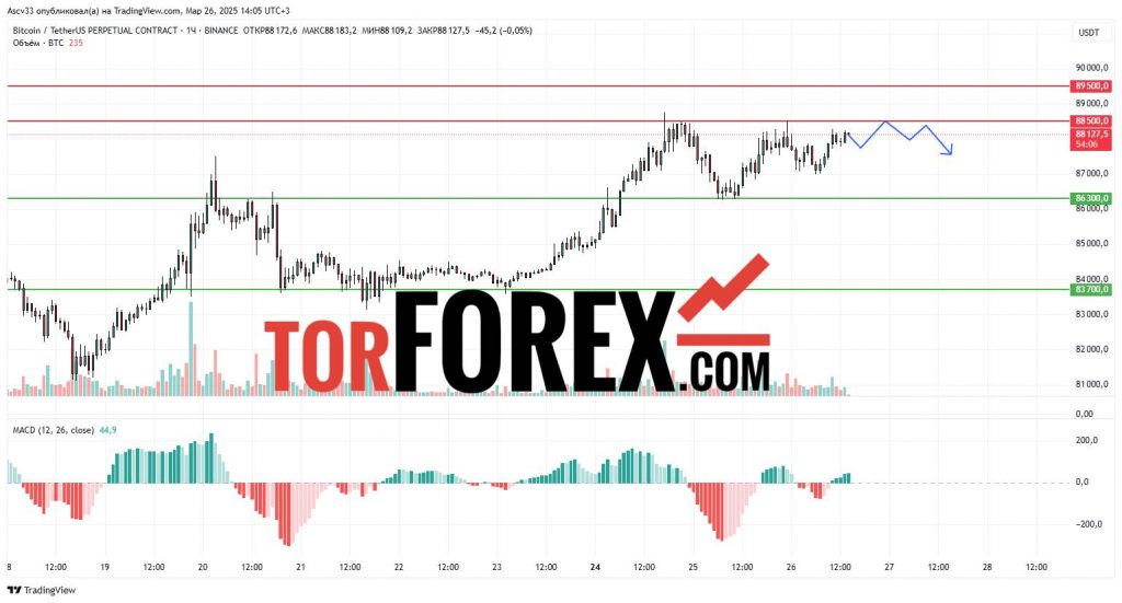 - $88 500 — ближайшее препятствие, пробой которого может ускорить движение в сторону $89 500;