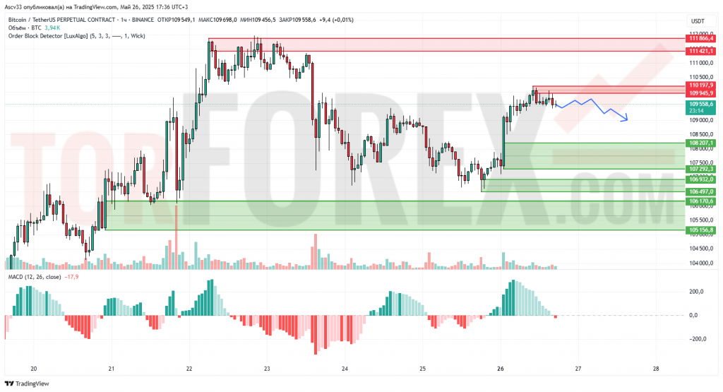 Пара BTC/USDT находится в фазе консолидации после недавнего роста. Цена торгуется вблизи важной зоны сопротивления, отмеченной красным цветом (109 945,9 — 110 197,9). На графике видно, что восходящее движение замедлилось, и цена формирует горизонтальный диапазон. Индикатор MACD, хотя и находится в положительной зоне, показывает снижение гистограммы и приближается к нулю, что указывает на ослабление бычьего импульса и возможное начало бокового движения или коррекции. Объемы торгов остаются умеренными.