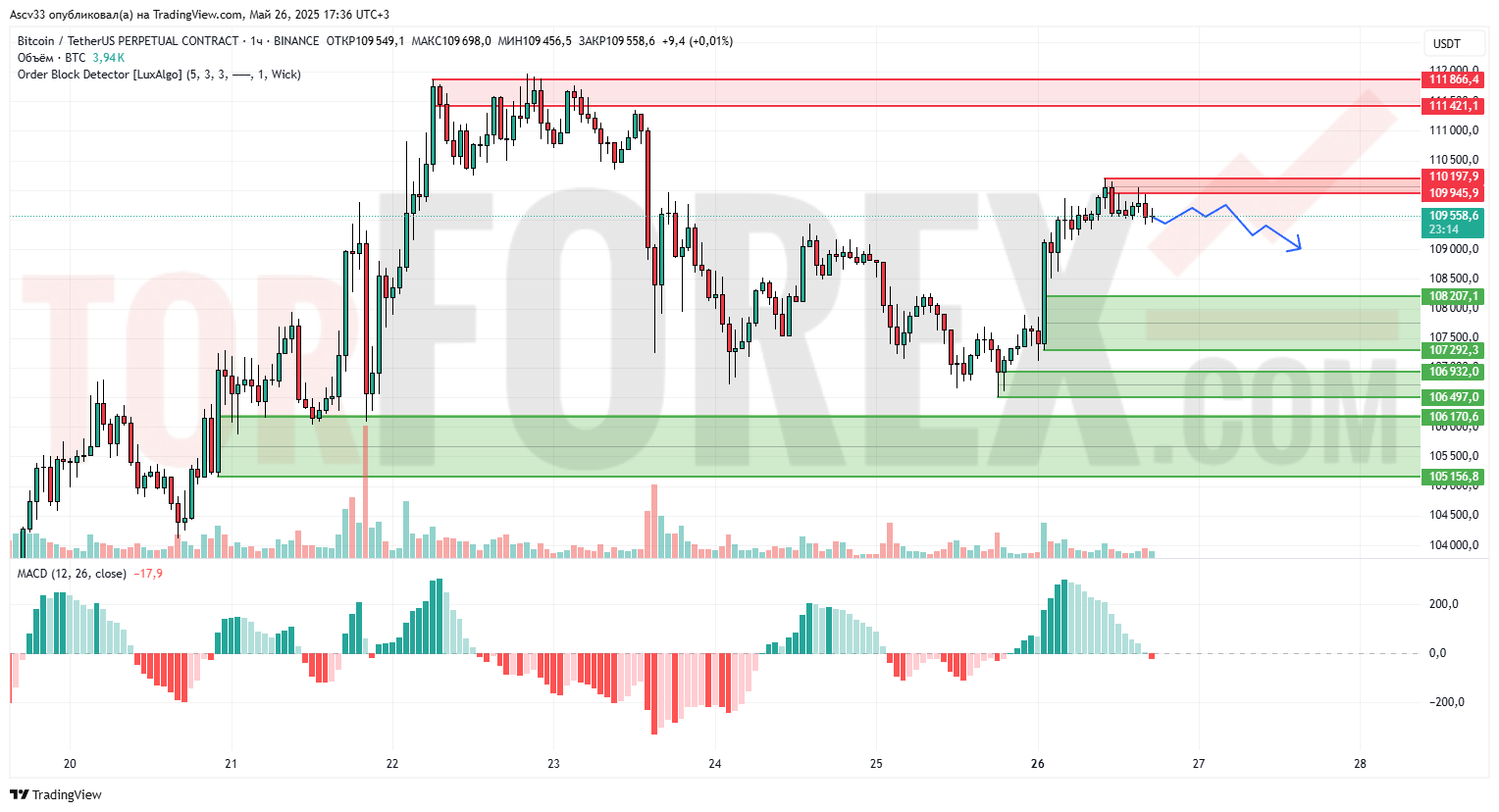 - 109 558,6 — ближайший уровень поддержки, текущая цена.