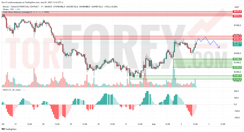 Ближайшие сутки BTC/USDT, вероятно, будет консолидироваться в пределах 85 150–85 850 с высокой вероятностью коррекции в направлении 83 300–82 500. Если быкам не удастся пробить 85 850, то может последовать откат в зону спроса.