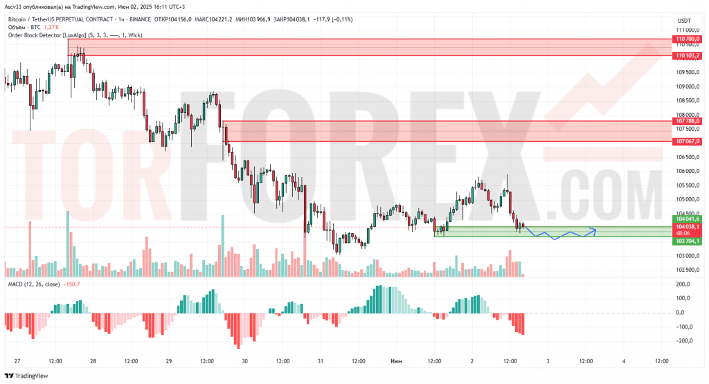 Ожидается продолжение консолидации в диапазоне 103700–104500. Пробой ниже может спровоцировать снижение к 101800. Альтернатива – краткосрочный отскок к 105000, но без импульса выше 107000 рост под вопросом.