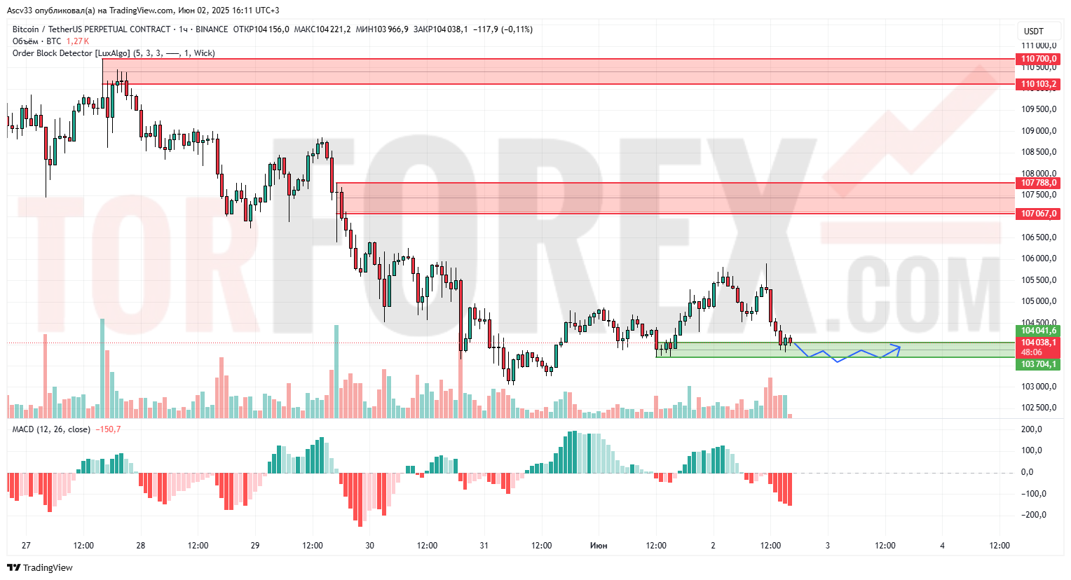 Bitcoin продолжает торговаться в нисходящем канале. После краткосрочного восстановления цена вновь спустилась к области поддержки 103700–104000. Индикатор MACD указывает на продолжающееся давление со стороны продавцов, а объёмы остаются умеренными, что подтверждает сценарий боковой консолидации.