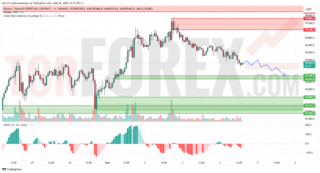 Вероятен ретест уровня 94 750 и возможный пробой к 93 500–93 100, если давление продавцов усилится. Восстановление возможно только при возвращении выше 96 000.