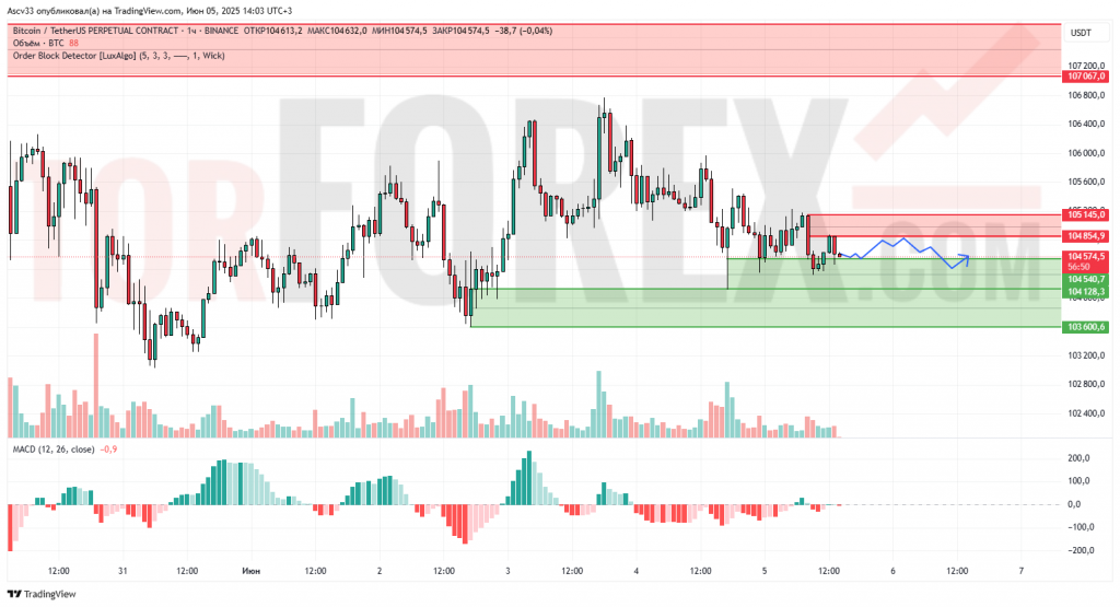 BTC/USDT, скорее всего, продолжит колебаться в диапазоне 104 100–104 900. Если не удастся пробить 105 145, велика вероятность снижения к 104 100 и ниже. В случае уверенного закрепления выше 105 200 открывается путь к 106 000–107 000.
