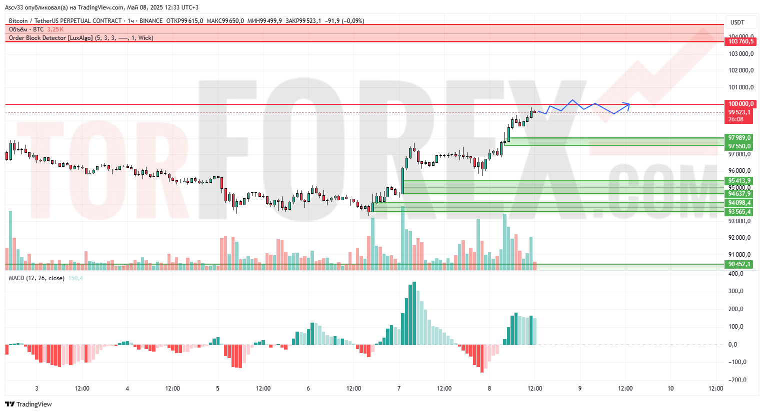 Биткоин уверенно восстановился после предыдущего снижения и тестирует важный уровень вблизи 100 000. Цена консолидируется в зоне между 99 500 и 100 000, демонстрируя устойчивый интерес покупателей. MACD показывает растущий импульс, однако наблюдаются первые признаки замедления на подступах к круглому уровню.