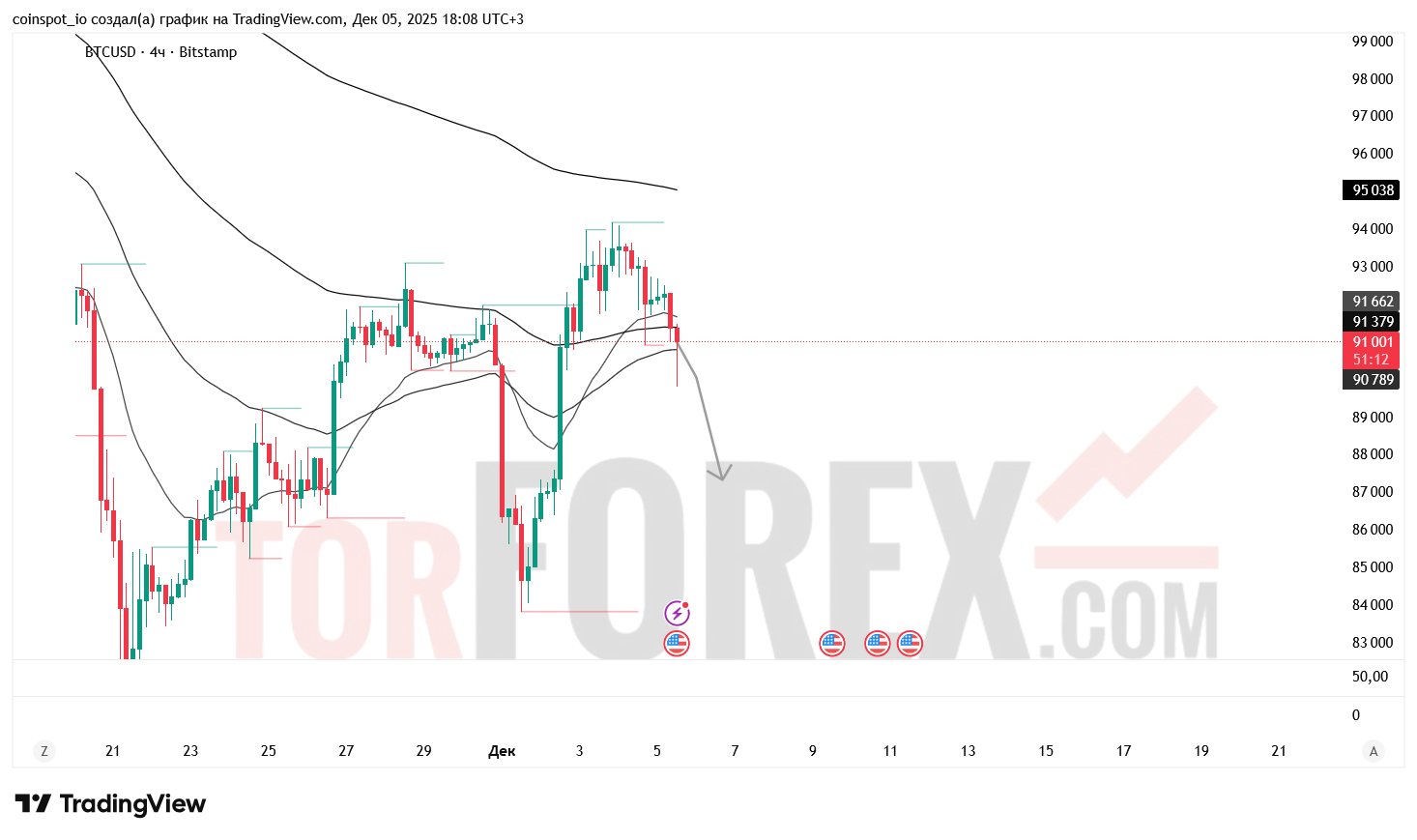Bitcoin завершает сессию 5 декабря на отметке 91 345 USD, снизившись на 0.82%. После неудачного теста уровня 92 500 USD цена демонстрирует признаки углубления коррекции. На 4-часовом графике наблюдается пробой средней линии Bollinger Bands вниз, а объём торгов остаётся ниже среднего — 1.32K против 3.09K. Структура рынка смещается в сторону давления продавцов, при этом доллар укрепляется против основных валют.