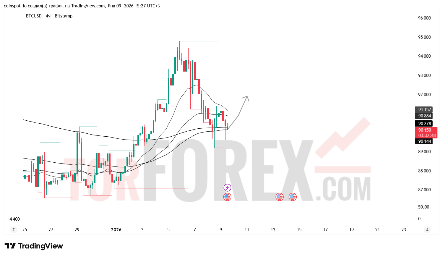 На 10 января 2026 года BTC/USD сохраняет нейтрально-медвежью структуру с признаками углубления коррекции. Основной сценарий — восстановление к 91 928–94 800 USD при пробое зоны сопротивления. Альтернативный сценарий — откат к 88 000–86 500 USD при отказе от уровня 90 169 USD.