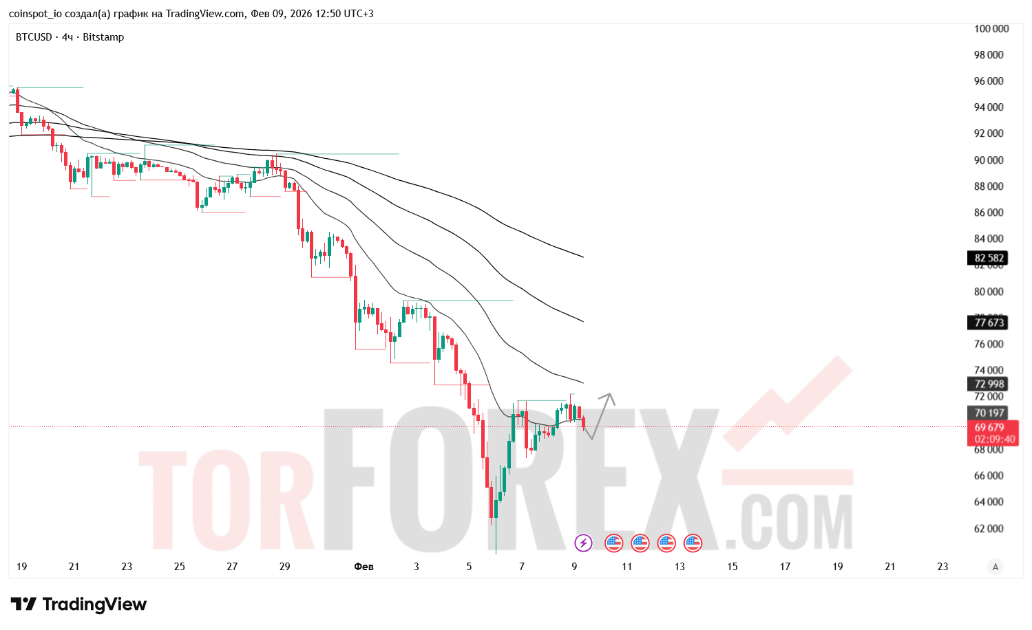 BTC/USD на 4‑часовом таймфрейме удерживается в нисходящей фазе после серии пониженных максимумов и пробоя ключевых поддержек. Цена закрепилась в районе 69 600 USD, где формируется локальная зона баланса. Структура рынка остаётся медвежьей, но индикаторы показывают признаки замедления импульса. На 10 февраля 2026 года ожидается повышенная волатильность в пределах сформированных FVG‑зон и кластеров EMA.