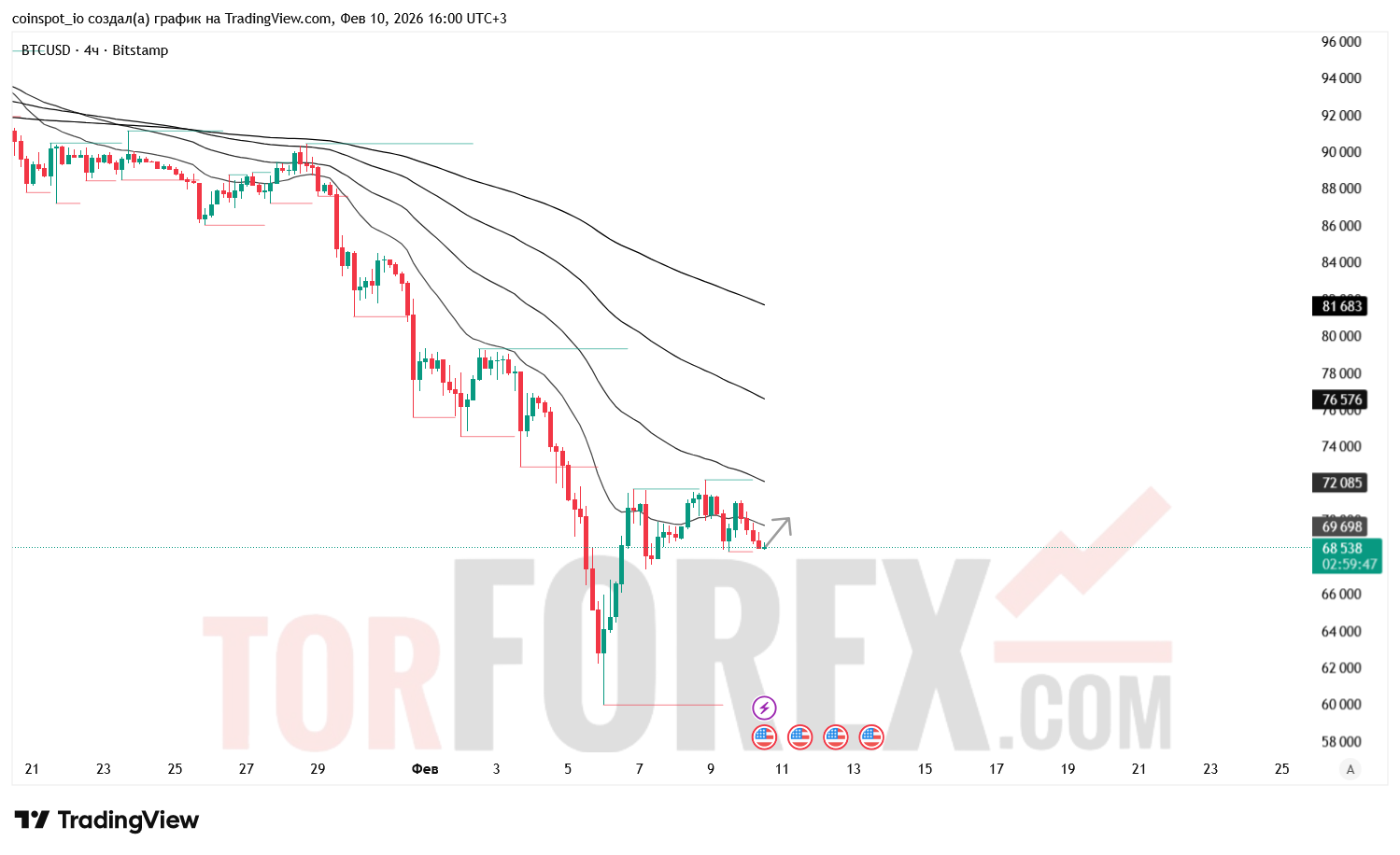 BTC/USD на 4‑часовом таймфрейме продолжает движение в нисходящей структуре, обновляя локальные минимумы и удерживаясь под ключевыми динамическими уровнями. Цена закрепилась в районе 68 600 USD, где формируется краткосрочная зона консолидации после очередного импульса вниз. На 11 февраля 2026 года основное внимание сосредоточено на реакции цены на FVG‑зоны, структуру Pivot High/Low и конфигурацию EMA‑ленты, которые определяют ближайшие уровни ликвидности и потенциальные сценарии движения.
