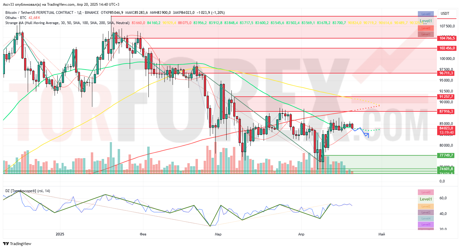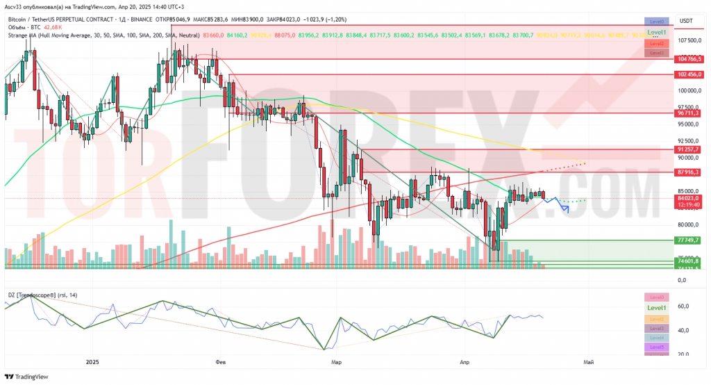 - При пробое поддержки в районе 83 600 долларов возможен уход цены в зону 77 750–74 600 долларов.
