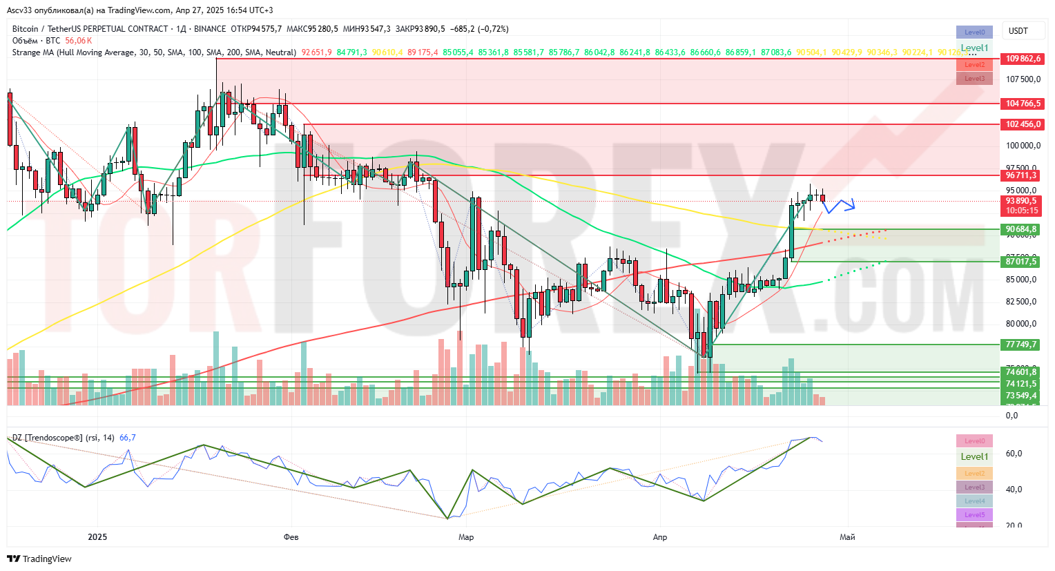Цена на биткойн демонстрирует устойчивую положительную динамику, достигнув локального сопротивления после сильного роста в середине апреля. На фоне замедления восходящего импульса сформировалась зона консолидации, что создаёт условия для коррекции или продолжения движения вверх.