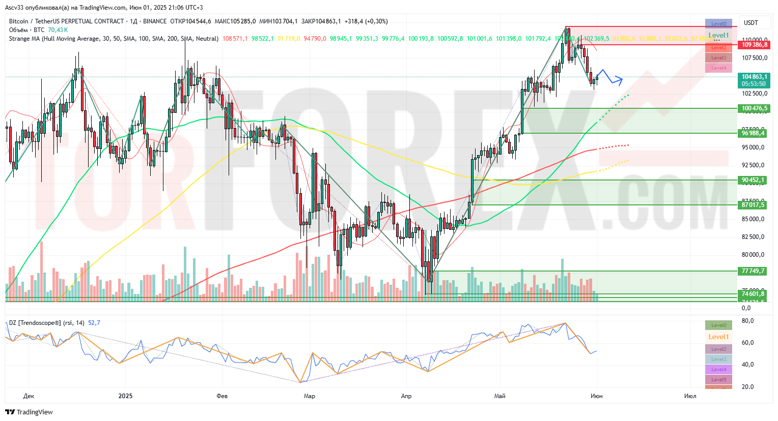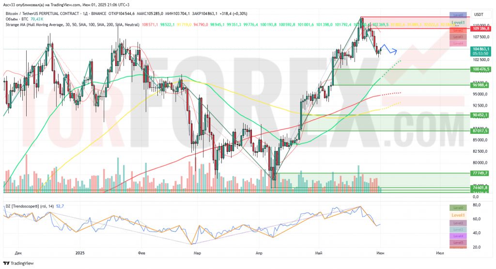 Bitcoin (BTC) завершил май под уровнем сопротивления вблизи $109 000, не сумев закрепиться выше локального экстремума. Начало июня ознаменовалось снижением торговой активности и умеренной технической коррекцией. На фоне ослабления импульса и появления сигналов разворота возможна консолидация или углублённый откат.