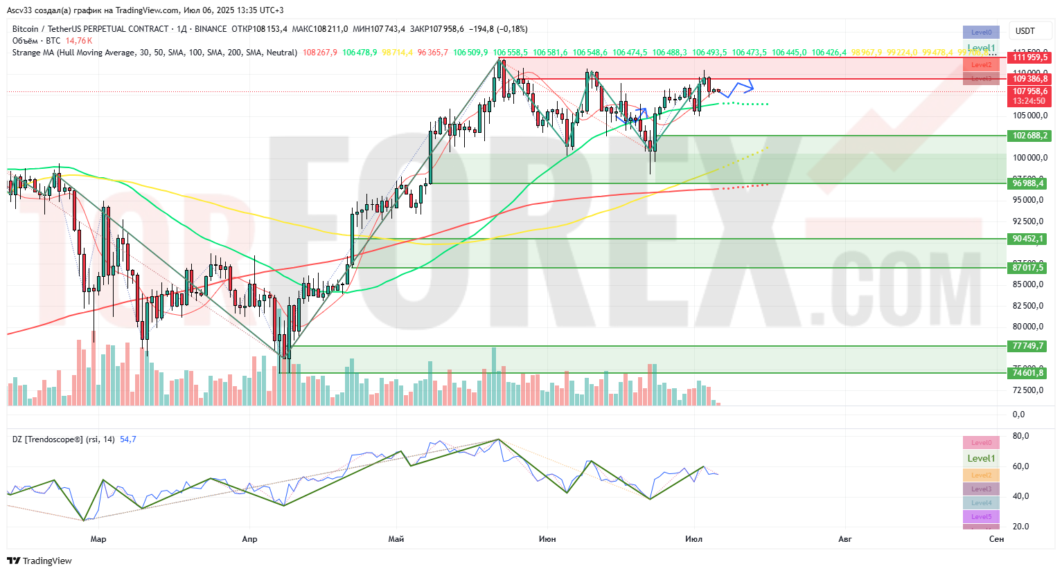 На дневном графике BTC/USDT цена торгуется в диапазоне $107,000–$108,000 после неудачной попытки пробоя зоны медвежьего Order Block (OB) на уровне $109,300–$111,900. Эта область остаётся ключевым сопротивлением, сформированным после отката от весеннего максимума.